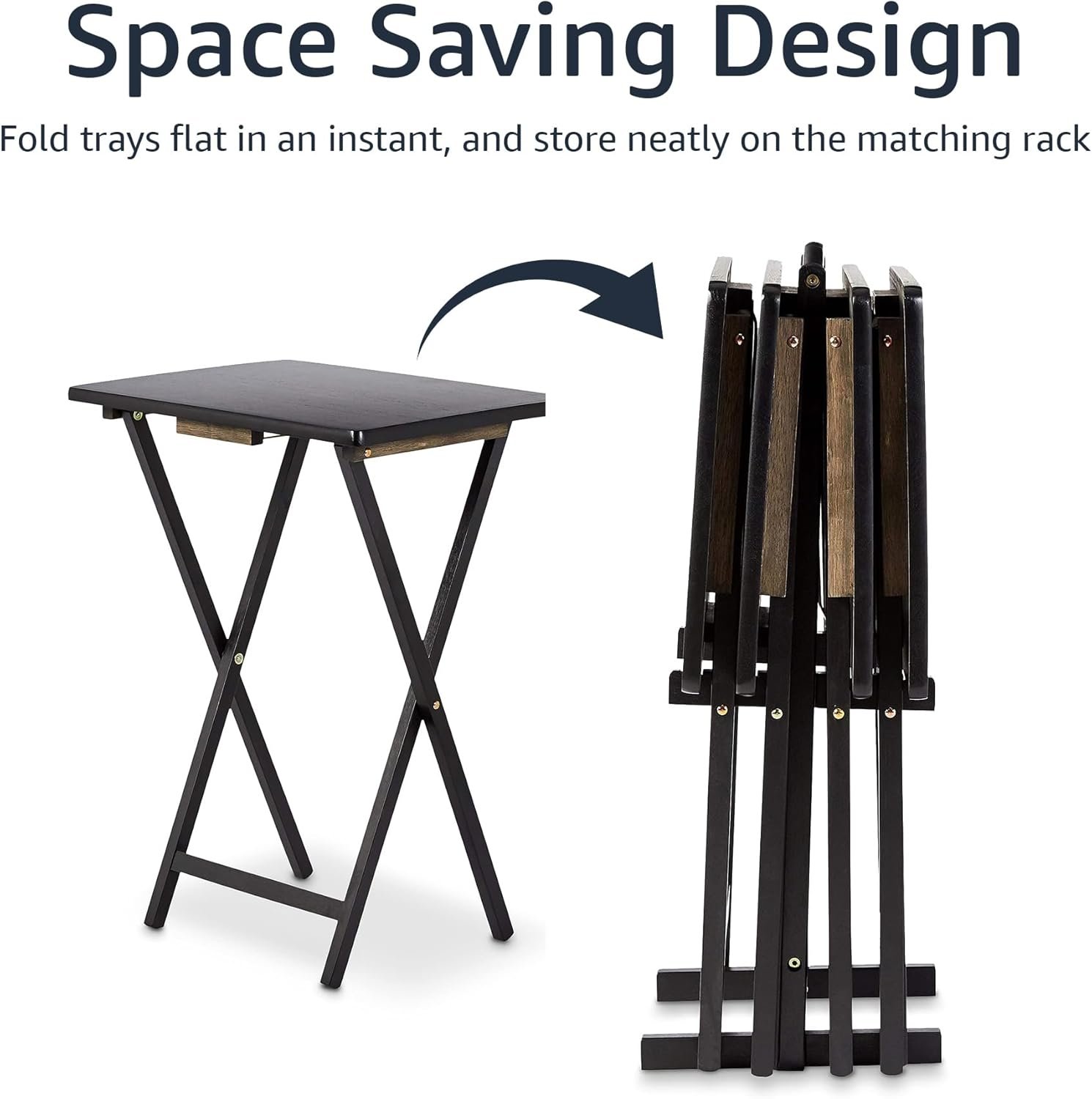 Upgrade your home convenience with the Amazon Basics Portable Foldable TV Tray Table 4-Pack, featuring sturdy wood construction and a sleek black finish. Each tray provides a spacious 15 x 19-inch surface, perfect for meals, work, or hobbies, and folds flat for easy storage in the included matching rack. Ideal for tight spaces, these versatile tables are stable, portable, and built to last—making them a smart addition to any living space.