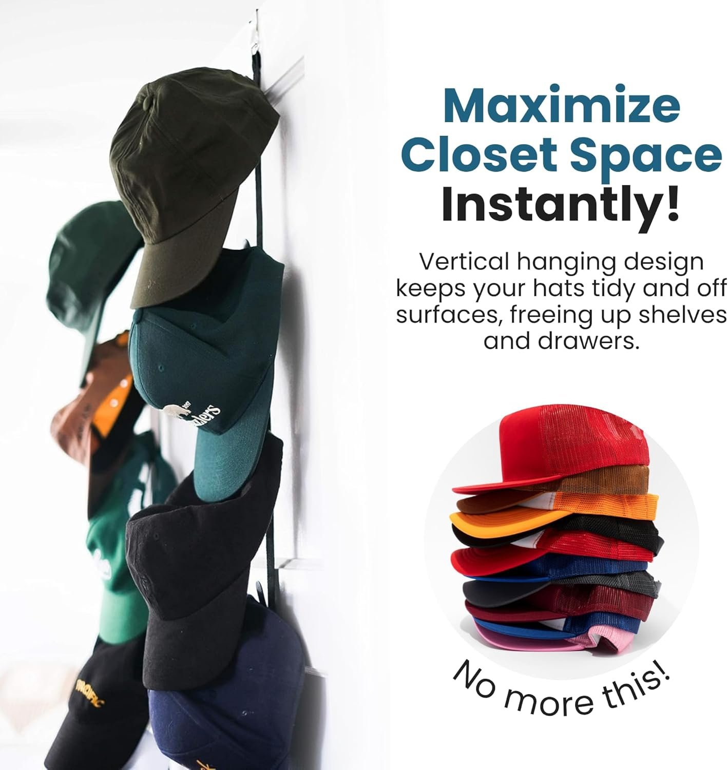 • Smart Space Saving: Get hats off the floor and organized vertically, which frees up shelf and drawer space. Great for maximizing closet storage with a door hanger organizer setup.